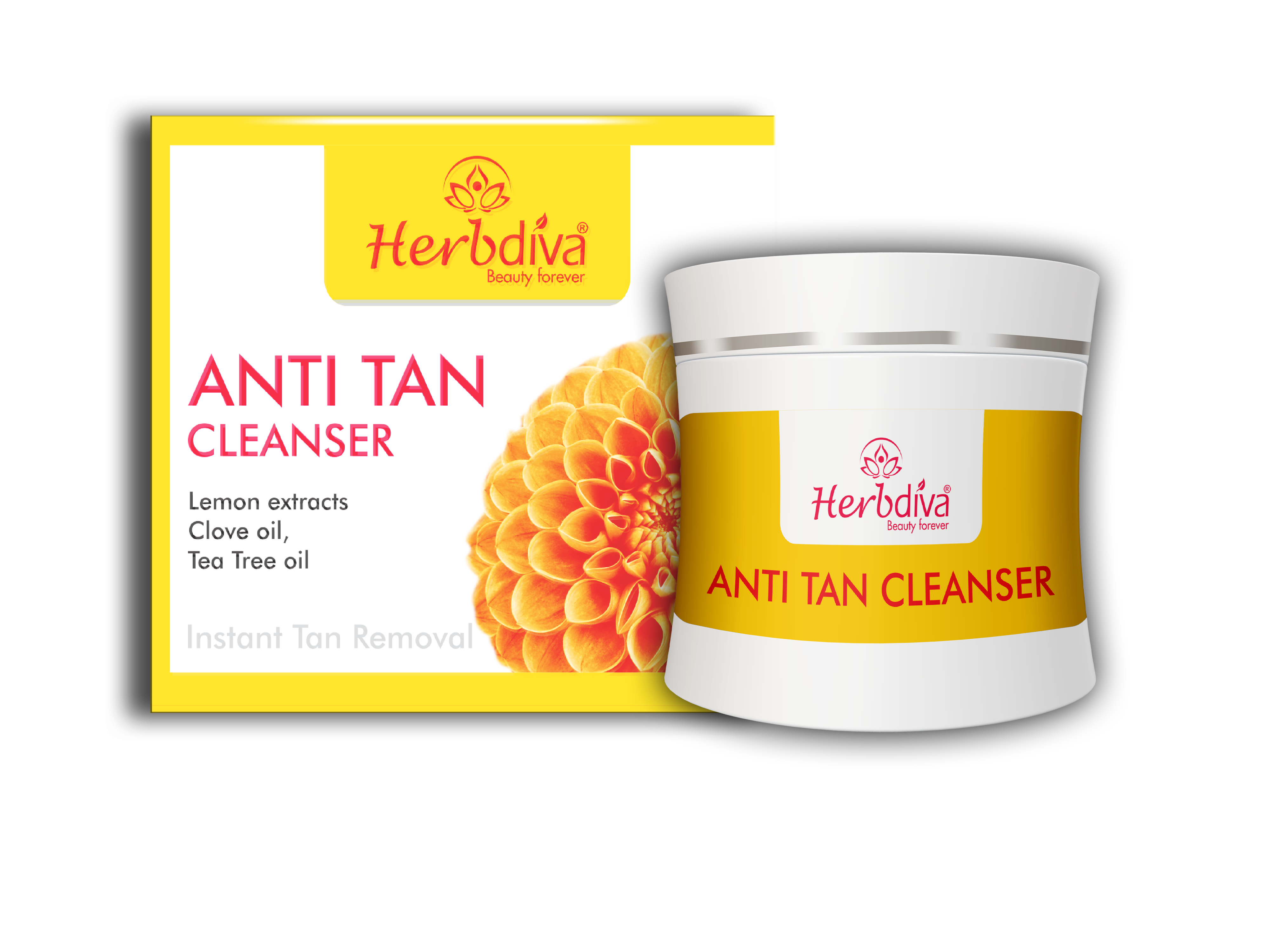 Herbdiva Anti Tan Cleanser is a natural face cleanser that lightens blemishes and pigmentation spots while tightening the skin. It contains natural ingredients like Kojic, Milk Protein, Eucalyptus Oil, Peppermint Oil, and herbal extracts like aloe-vera, strawberry, and pomegranate granules. It provides complete protection against UV rays, repairs skin damage, and reduces the appearance of open pores.