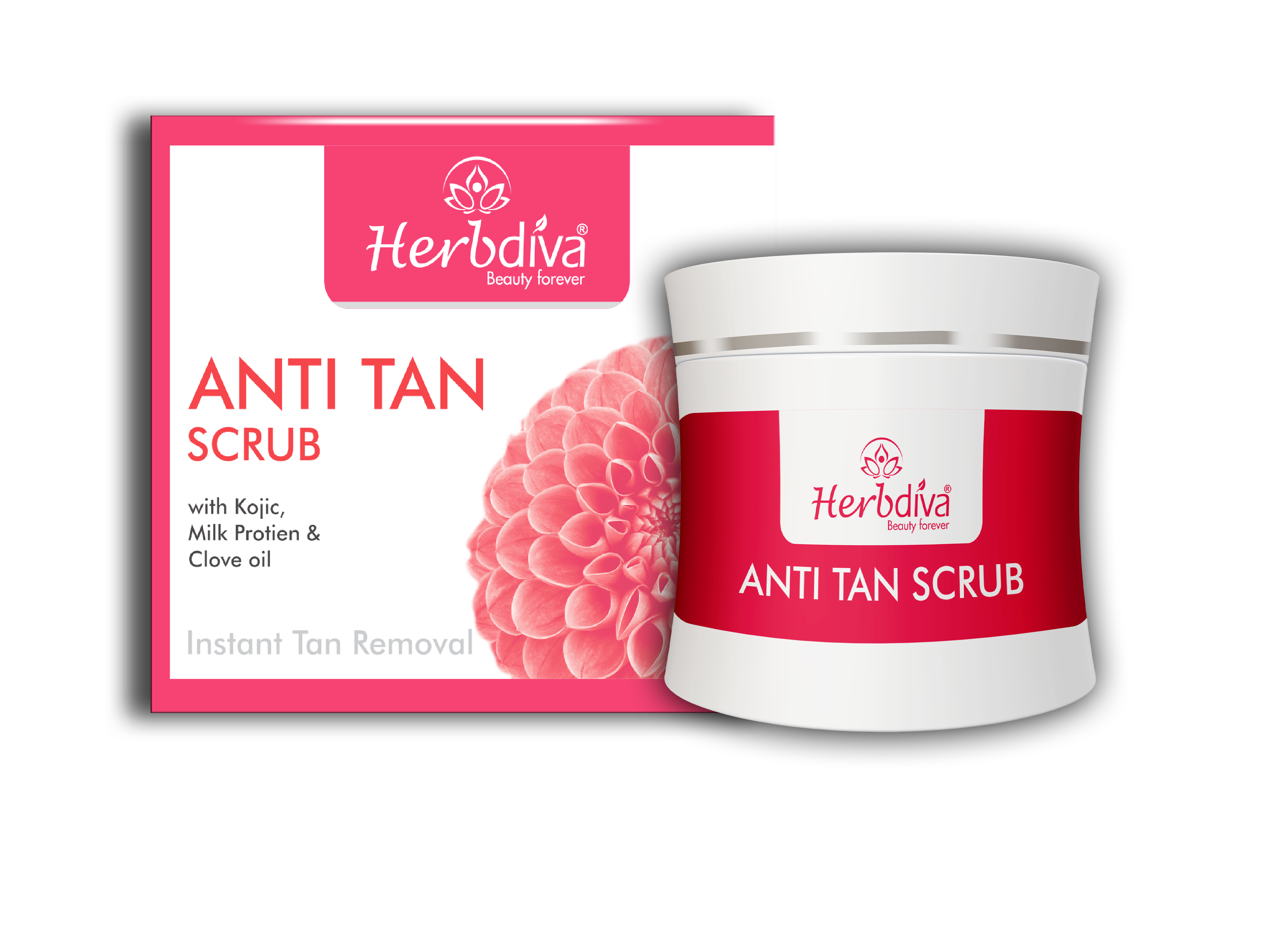 Herbdiva Anti Tan Scrub is a natural face scrub that lightens blemishes and pigmentation spots while tightening the skin. It contains natural ingredients like Kojic, Milk Protein, Eucalyptus Oil, Peppermint Oil, and herbal extracts like aloe-vera, strawberry, and